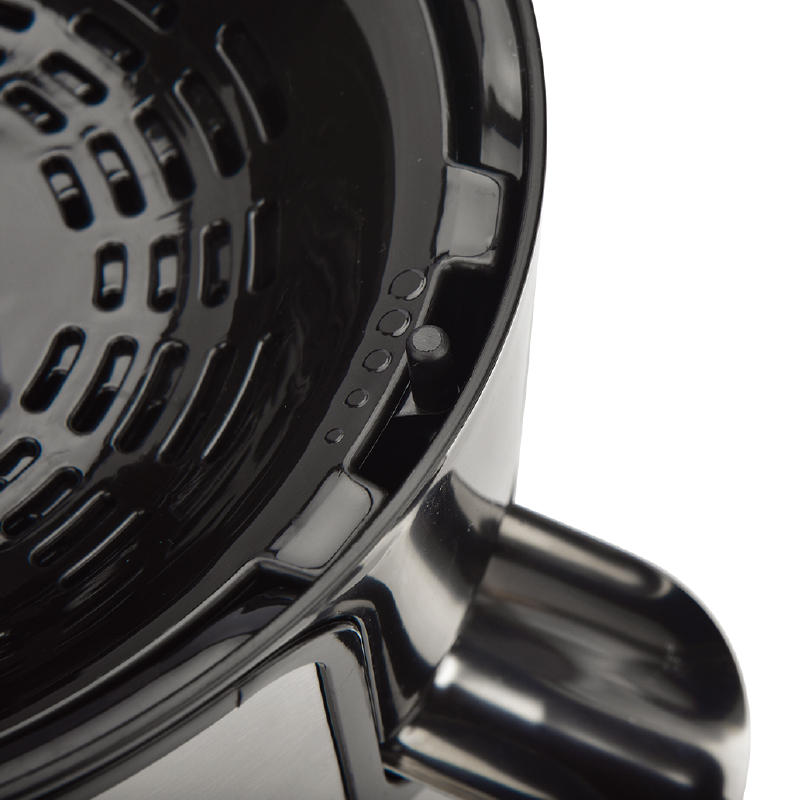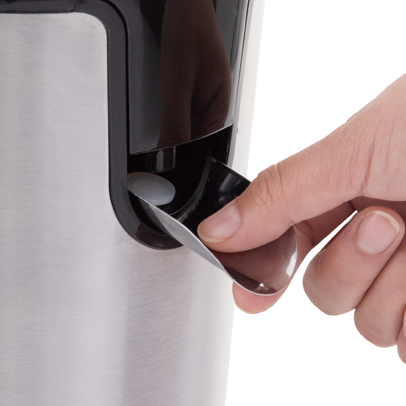 - Конусовиден цилиндър и дизайн на пресоващата дръжка за оптимално изстискване на сока.