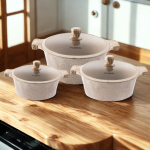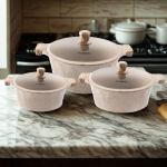 PEARL SERIES впечатлява с елегантна визия и премиум излъчване. Изчистените форми и красивата гранитна текстура създават усещане за класа във всяка кухня. Универсалните размери и модерен силует правят комплекта отличен избор както за домашна, така и за професионална употреба. Дръжките и капаците са проектирани с мисъл за ергономията – лесни за хващане и стабилни дори при пълно натоварване. Подходящи са както за ежедневно ползване, така и за специални поводи.