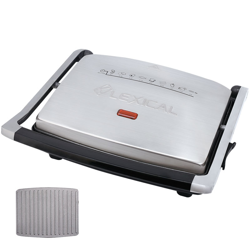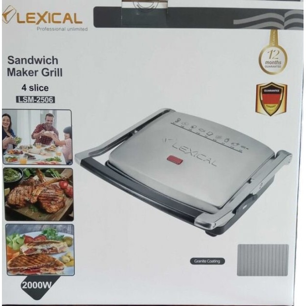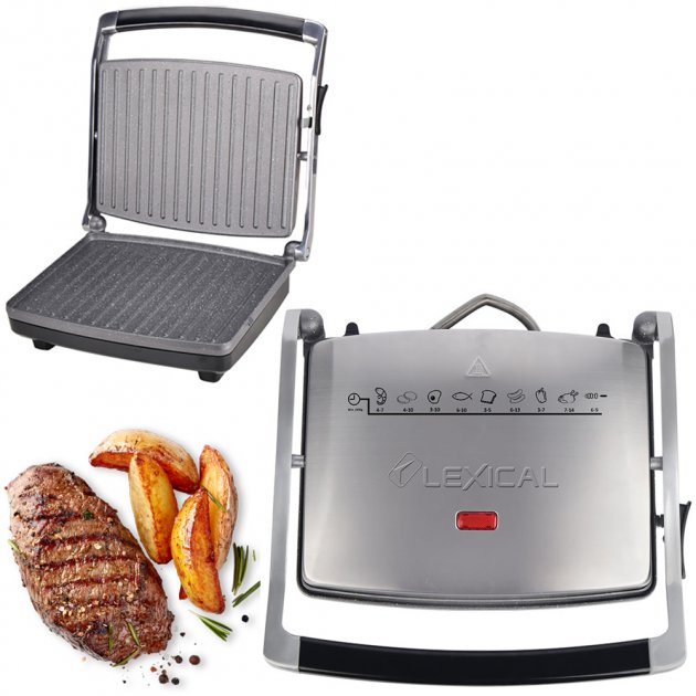 Мултифункционална тостер преса Lexical LSM-2506. Пригответе вкусни меса и сандвичи бързо и лесно. Стабилна работа с незалепващи плочи и стоманен корпус.